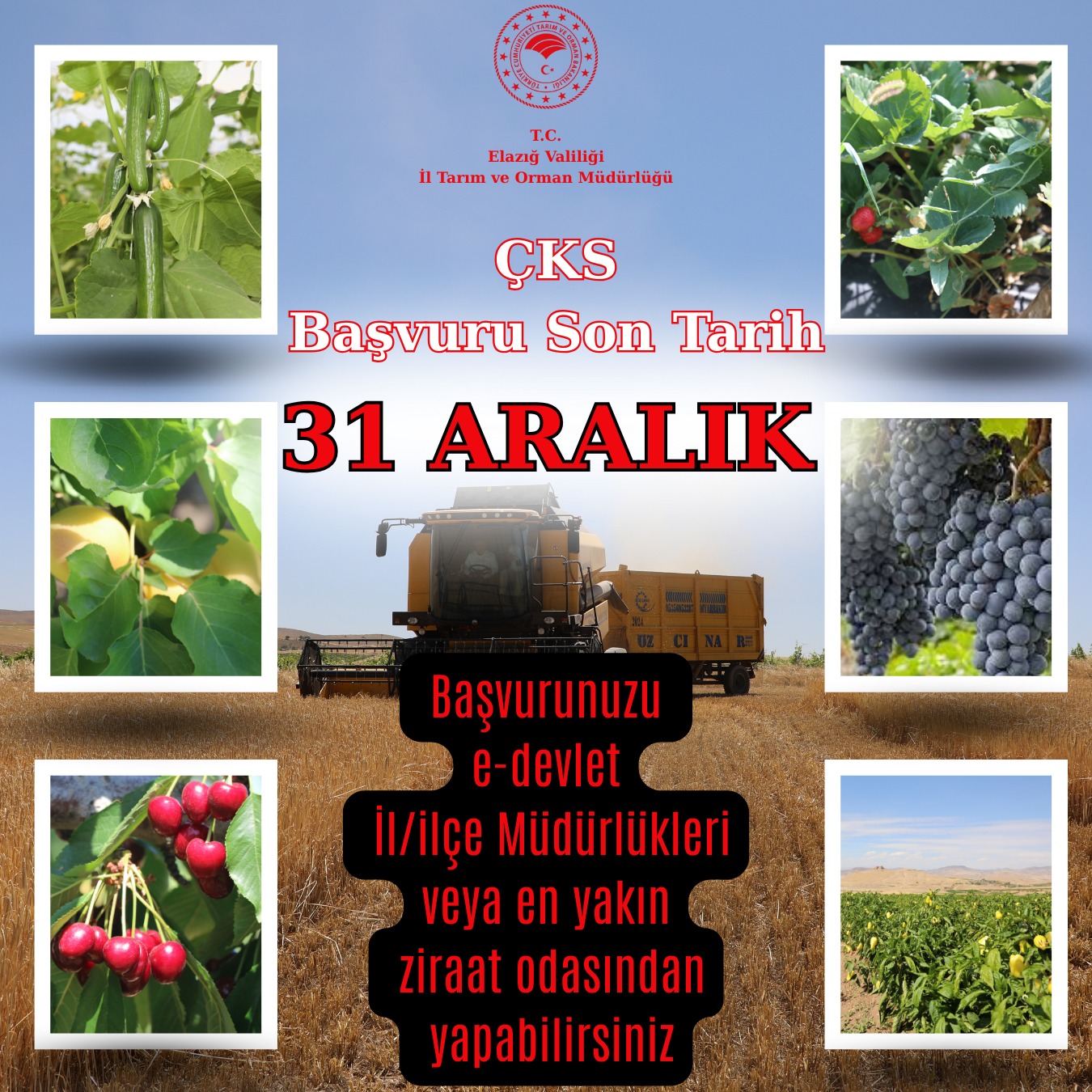 Tarımsal desteklerden yararlanmak, üretimi güvence altına almak ve planlı tarım uygulamalarına dâhil olmak için Çiftçi Kayıt Sistemi (ÇKS) başvurularını zamanında yapmayı unutmayınız.