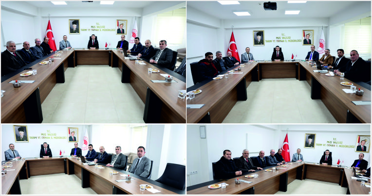 İl Tarım ve Orman Müdürü Necattin Gönç'ün başkanlığında düzenlenen ve ilde yürütülen tarımsal faaliyetlerin değerlendirildiği toplantıya; İl Müdür Yardımcıları Eşref Süne, Muhammed Şen, Bitkisel Üretim ve Bitki Sağlığı Şube Müdürü Samet Aşkın, Muş Ziraat Odası Başkanı Hakim Yıldırım, Malazgirt Ziraat Odası Başkanı Tahsin Kılıç, Bulanık Ziraat Odası Başkanı Nevzat Taşdemir, Bulanık Tarım Kredi Kooperatifi Müdürü Nimet Vurar, Muş İl Pancar Ekicileri Kooperatifi Başkanı Mehmet Ali Seçkin, Kooperatifi Başkan Yardımcısı Fahrettin Sönmez, Pancar Ekicileri Kooperatifi Müdürü İnan Yaman, Muş Tarım Kredi Kooperatifi Müdürü Tahsin Yılmaz katıldı.